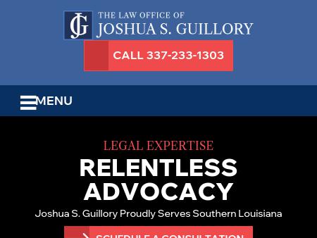 139. The Law Office of Joshua S. Guillory, LLC Lafayette Criminal Defense Lawyer | New Iberia Personal Injury Attorney | Opelousas DUI For counsel from a dedicated Lafayette criminal defense and personal injury lawyer, call The Law Office of Joshua S. Guillory, LLC, now: 337-233-1303.