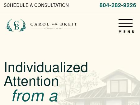 93. Carol A. N. Breit, Attorney at Law Richmond Divorce Lawyer | Virginia Equitable Distribution Lawyer | Petersburg Mechanicsville Chester Do you need an experienced attorney in Richmond, Virginia? Call 804-282-9226 to reach Carol A. N. Breit, Attorney at Law, who has been representing clients for more than 30 years.