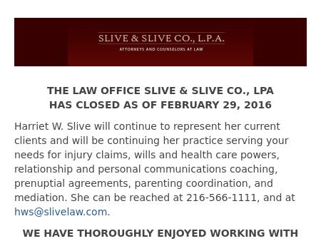 42. Slive & Slive, Co. L.P.A. Cleveland Family Law Lawyer | Ohio Personal Injury Attorney The Cleveland attorneys at Slive & Slive have significant experienced with family law, personal injury, estate planning and criminal defense representation.