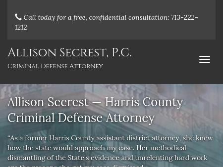55. Allison Secrest, P.C. Harris County Criminal Defense Attorney | Drug Charges | DUI Arrest If you are facing criminal charges, contact Allison Secrest, P.C., at 713-364-0452 to speak to an experienced Harris County criminal defense attorney.