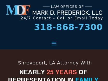 31. Law Offices of Mark D. Frederick, LLC Shreveport Personal Injury, Family Law and Criminal Law Attorney If you are injured in an accident, planning a divorce or arrested for a crime in Shreveport, attorney Mark D. Frederick protects your rights. 866-385-4007.