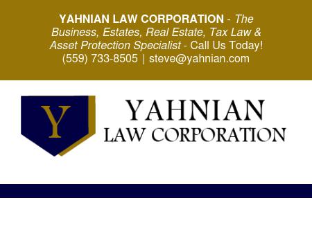15. Yahnian Law Corporation Yahnian Law Corporation - Tax Law, Asset Protection, Estate Planning YAHNIAN LAW CORPORATION is a Visalia based Business and Corporate, Estate Planning and Administration, Probate, Real Property, Asset Protection Planning and Tax Law firm.
